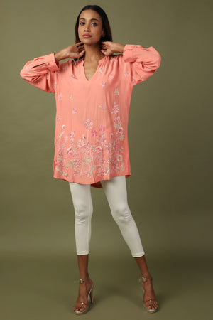 Experience the perfect blend of style and comfort with our crepe-based top. The mandarin neck and embroidered detailing elevate the look, while the pull-on closure ensures a seamless fit. This top is a must-have for fashion-forward individuals.