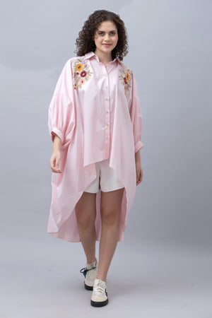 - Oversized pink shirt with relaxed silhouette crafted in lightweight cotton-blend fabric.